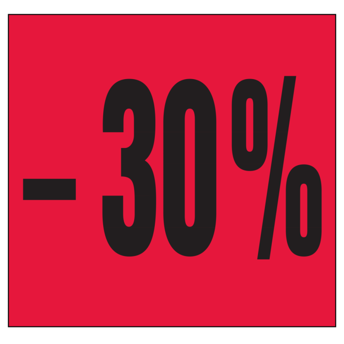 Rechteckige Etiketten im Format 29 x 28 mm in in fluor-rot, mit Aufschrift "-30%", permanent haftend.