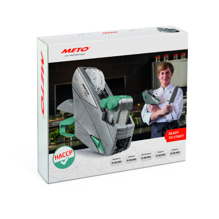 Zweizeilige Preisauszeichner Meto Classic M mit 14 vordefinierten Texten in der oberen Zeile für die sichere Überwachung, Dokumentation und Kontrolle bei der Vorbereitung von Lebensmitteln spezielle für die Gastronomie und 10 alphanumerischen Zeichnen in der unteren Zeile zur Datumskennzeichnung im Kit mit 11.000 Etiketten mit permanenter Haftung. Die Zeichenhöhe liegt bei 4,3 mm oben und unten.