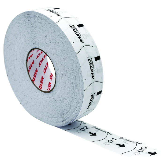 Weiße Meto T90 Tickets – perfekt für den Einsatz im Turn-O-Matic D90 Ticketspender. 6 Rollen mit je 4.000 fortlaufend nummerierten Tickets.