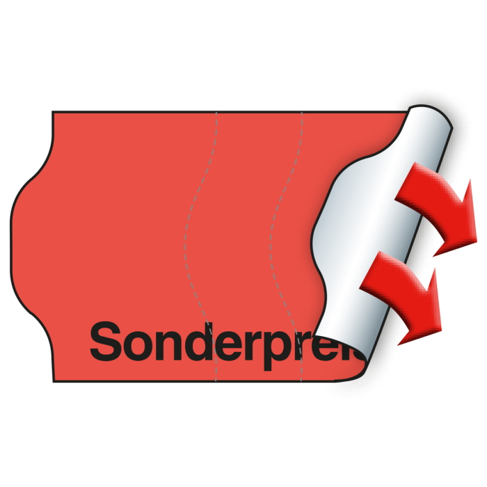 Wellenrand Etiketten im Format 32 x 19 mm in fluor-rot, mit Aufschrift "Sonderpreis", permanent haftend, mit Sicherheitsschnitt.